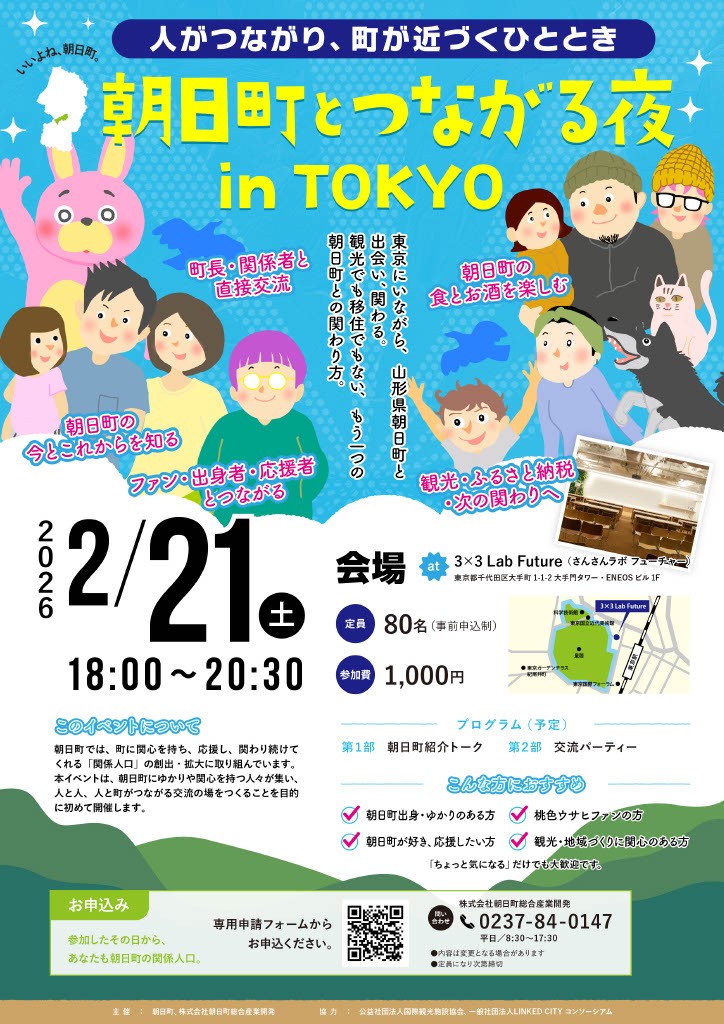 東京・大手町開催 朝日町とつながる夜 in TOKYO 東京にいながら、朝日町と出会い、関わる。 観光でも移住でもない、「もう一つの朝日町との関わり方」が見つかる夜。 町長や関係者の朝日町紹介トーク、そして朝日町の食とお酒を楽しみながら交流しませんか? Asahi自然観のファンの皆さま、朝日町に興味がある方、朝日町出身者の方も、ぜひご参加ください。 2月21日(土)18:00~20:30 東京都大手町 3×3 Lab Future(さんさんラボ フューチャー) 参加費1,000円(事前申込制、定員80名) ▶ 詳しいご案内はこちら 朝日町とつながる夜 in TOKYO ▶ 申込はこちら