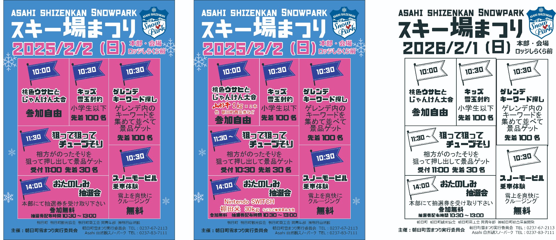 Asahi自然観スキー場まつりを2月1日(日)に開催します。 桃色ウサヒとじゃんけん大会とお楽しみ抽選会には今年も超豪華景品をご用意しました。 他にもゲレンデキーワード探しやキッズ雪玉射的など子供から大人までお楽しみいただける内容となっております。 是非ご家族皆様でお越しください。 日時:令和7年2月1日(日曜日) 午前10時から 会場:Asahi自然観スノーパーク ロッジしらくら前にて お問い合わせ先: ◇朝日町雪まつり実行委員会(総合産業課内) 電話番号 0237-67-2113 ◇Asahi自然観スノーパーク 電話番号 0237-83-7111