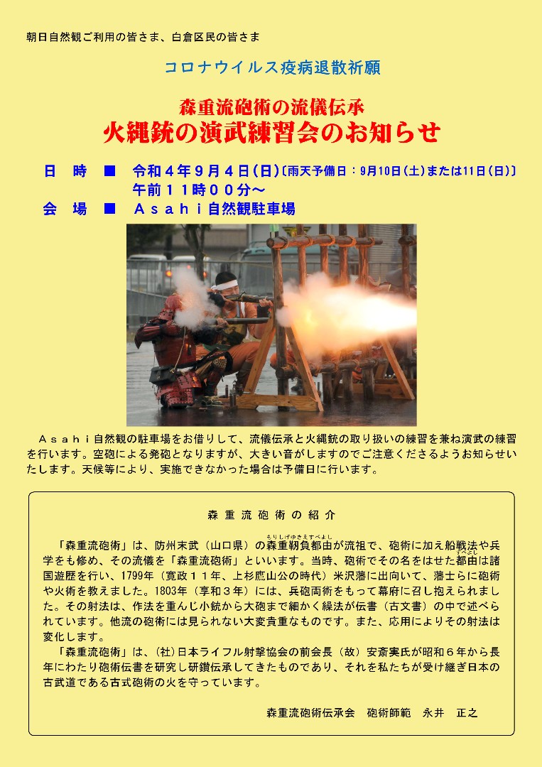 Asahi自然観の駐車場にて、コロナウイルス疫病退散祈願「森重流砲術の火縄銃演武練習会」が行われます。 練習会場にて、迫力ある火縄銃の演武をご覧いただけます。 ◇日 時 9月4日(日)午前11時~ ※1時間程度 ◇会 場 Asahi自然観 ホテル前大駐車場 ※入場無料