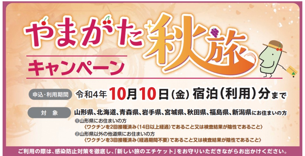 キャンペーン期間の延長 「やまがた秋旅キャンペーン」は令和4年10月10日(月)宿泊(利用)まで、期間延長となります。 【割引内容】 1,000円のお支払いごとに500円の割引(1人1泊につき最大5,000円割引) 1人1泊につき県内観光立寄施設や山形県新型コロナ対策認証飲食店等で利用可能な2,000円分(1,000円券×2枚)の地域限定クーポン付き ※4,000円以上の宿泊プランまたは日帰りプラン(お食事付き、かつ、客室内での休憩などで一定時間の滞在があるプラン)が対象です。 ※地域限定クーポンはチェックイン時にお渡しいたします。有効期限は、チェックイン当日からチェックアウト当日24時までとなります。 【利用期間】 ~10月10日(月)宿泊(利用)分まで 【キャンペーン対象者】 山形県、北海道、青森県、岩手県、宮城県、秋田県、福島県、新潟県 にお住まいの方 【利用条件】 ・山形県民 ワクチンを2回接種済み(14 日以上経過)であること又は検査結果が陰性であること ・他道県民 ワクチンを3回接種済み(経過期間不要)であること又は検査結果が 陰性であること 【ご利用に必要な書類】 ・予防接種済証等(接種記録書、接種証明書を含む) ・ワクチン未接種の場合には、PCR検査や抗原定量検査の場合、宿泊日の3日前以降に発行された検査結果通知書等(陰性証明書を含む)の提示が可能な方。抗原定性検査の場合、宿泊日の前日又は当日の検体採取による検査結果が陰性とされた検査結果通知書等の提示が可能な方。 【お子様のご利用について】 同居する親等の監護者が同伴することを条件に12歳未満の検査証明書の提示は不要です。ただし、緊急事態宣言区域及びまん延防止等重点措置区域に該当する旅行者の場合、6歳以上12歳未満は検査証明書の提示が必要になります。 証明が出来ない場合、宿泊割引の対象となりません。 詳しくはキャンペーンサイトをご参照ください。 https://yamagata-fuyuwari.com/ すでにご予約済みの方は順次ご案内をさせて頂きます。 お急ぎの方はお電話でのご予約、お問い合わせをお願いいたします。