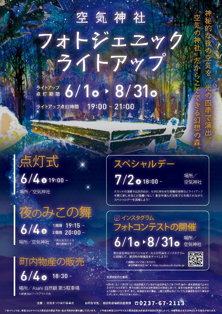 神秘的な夜の空気を光の四季で演出します。 空気の神社だからこそできる幻想の森。 ■期日 6月1日(水)~8月31日(水) ■時間 19:00~21:00 ■場所 空気神社 夜の空気神社を光で照らし、フォトジェニック(写真映え)な空間を演出します。 インスタグラムフォトコンテストも同時開催! 6月4日(土) 18:30~町内物産の販売 19:00~点灯式 19:15~夜のみこの舞(1回目) 20:00~夜のみこの舞(2回目) 7月2日(土) 18:00~スペシャルデー企画 詳しい日程と内容は下記リンク先にてご覧ください。 空気神社フォトジェニックライトアップ(PDF)