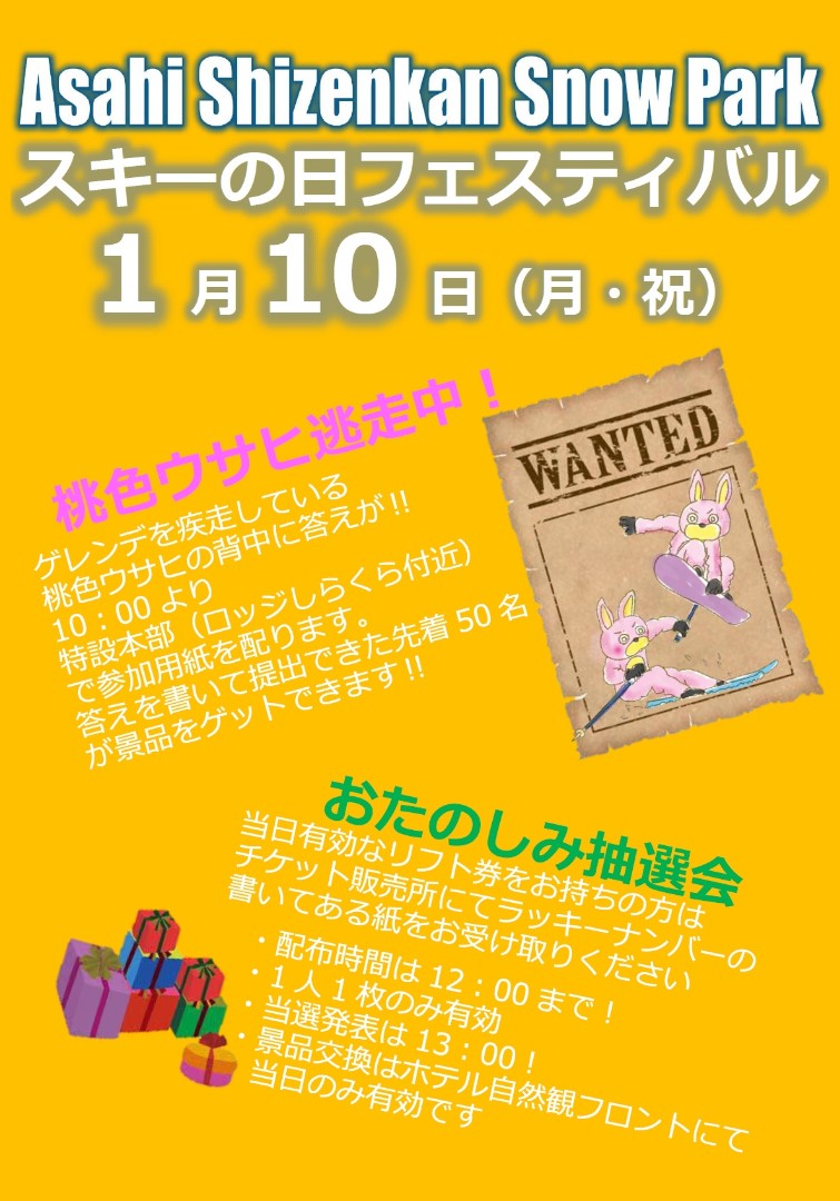 1月10日(日・祝)はAsahi自然観スノーパークスキーの日フェスティバルを開催いたします。 桃色ウサヒがゲレンデを疾走するイベントや、おたのしみ抽選会などの楽しいイベントを予定しております。 【桃色ウサヒ逃走中!】 10:00~ ロッジしらくら前、特設捜査本部にて参加用紙を配布します。 ゲレンデを疾走し逃走している桃色ウサヒの背中にかかれた答えを見つけるものです。 先着50名様は景品を獲得できます。 【おたのしみ抽選会】 8:30~ ※抽選券配布 12:00までの間、当日有効なリフト券をお持ちの方はチケット販売所で抽選券を受け取っていただきます。 【当選発表】 13:00 ホテル自然観・ロッジしらくら・レストハウス大空に当選番号を掲示いたします。 景品交換はホテル自然観にて ※当日のみ有効
