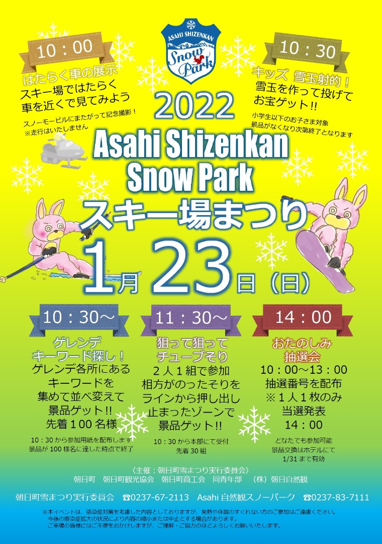 1月23日(日)は2022スキー場まつりを開催いたします。 会場:ロッジしらくら前 時間:10:00~ ◆スキー場ではたら車の展示 ゲレンデを整備する圧雪車・スノーモービルを展示 ◆キッズ雪玉射的 自分で作った雪玉を的めがけて投げてみよう ※小学生以下対象 ◆ゲレンデキーワードさがし 広いゲレンデ各所にあるキーワードを集めてみよう ※先着100名様(本部にて受付) ◆狙って狙ってチューブそり 2人1組でラッキーゾーン狙ってそりをすべらせよう ※先着30組(本部にて受付) ◆おたのしみ抽選会 人気ゲーム機や冬に嬉しい家電、朝日町の特産品や商品券などが当たります ※どなたでも参加可能(本部にて抽選番号券を受け取ってください/1人1枚) 当選発表は14:00 ホテル・ロッジしらくら・レストハウス大空に掲示 景品交換はホテルフロントにて1月31日まで有効 小さなお子様からご家族みなさんで楽しめるイベントとなっております。 どの企画も無料で楽しめますので、たくさんのご来場お待ちしております。
