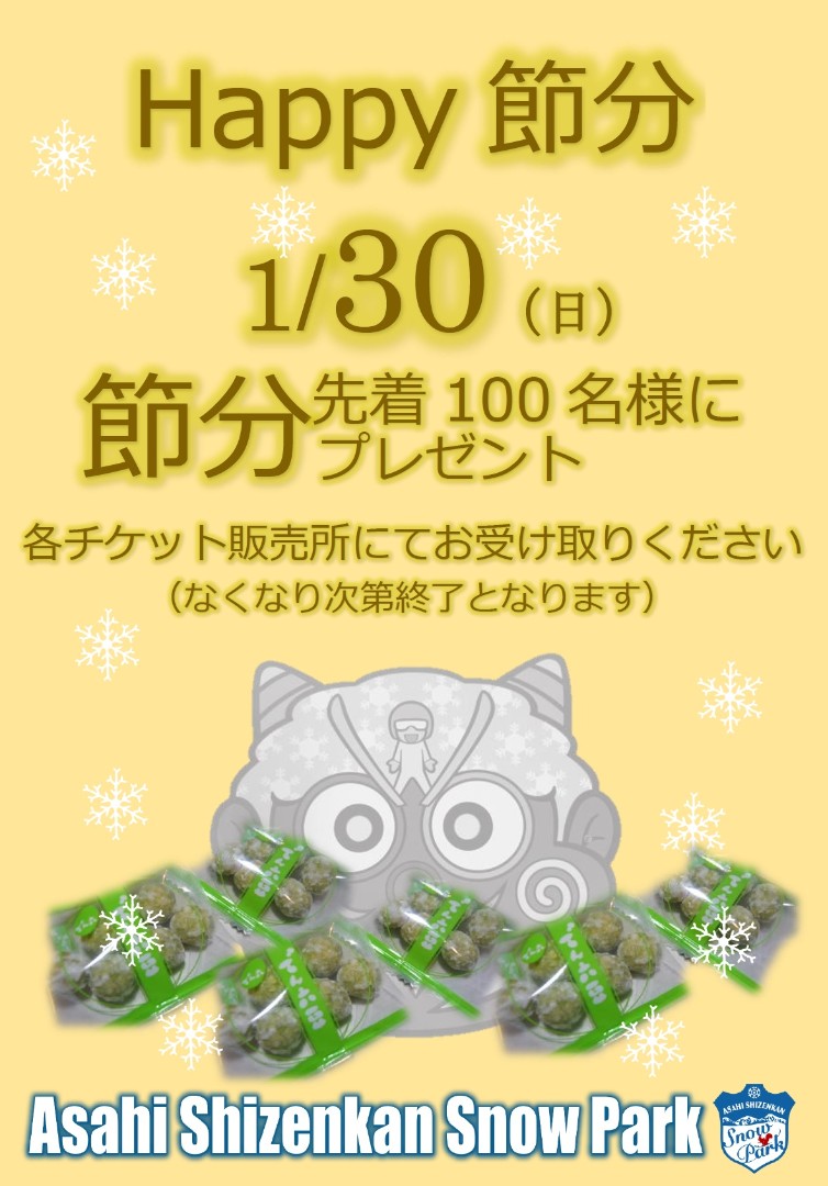 1月30日(日)はAsahi自然観スノーパークにて 「Happy 節分」として当日ご来場のお客様先着100名様に ささやかなプレゼントをお渡しいたします。 各チケット販売所にてお受け取りください。 ※なくなり次第終了となります