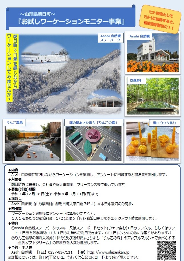 朝日町の四季折々の自然を感じながら仕事をしていただくとともに、食や体験(温泉やレジャーなど)を通して町内の魅力を感じていただき、今後の新たな人の流れや地域活性化を図ることを目的に「朝日町お試しワーケーションモニター事業」が始まりました。 ◆内容 Asahi自然観に宿泊しながらワーケーションを実施し、アンケートに回答すると宿泊費を割引します。 ◆対象者 朝日町外に在住し、会社員や個人事業主、フリーランス等で働いている方 ◆募集(対象)期間 令和3年12月18日(土)~令和4年3月13日(日)まで ◆宿泊について Asahi自然観 ※ホテル宿泊のみ対象。 ◆割引額 ワーケーション実施後にアンケートに回答いただくと、 1人1泊あたりの宿泊料金×1/2(上限5千円)×宿泊日数分を割引します。 ◆特典 ①Asahi自然観スノーパークのスキー又はスノーボードセット(ウェア含む)1日分レンタル、もしくはリフト1日券を対象期間中1人1回のみ無料で利用できます。(※1日レンタルの数には限りがあります。) ②りんご温泉の無料入浴券(1回分)及び道の駅あさひまち「りんごの森」のアップルマルシェで食べられる「生乳ソフトクリーム」の無料券を人数分進呈します。 詳しい内容は下記URLをご参照ください。 https://www.town.asahi.yamagata.jp/portal/soshikinogoannai/sogosangyoka/shoukoukankogakari/1/7948.html