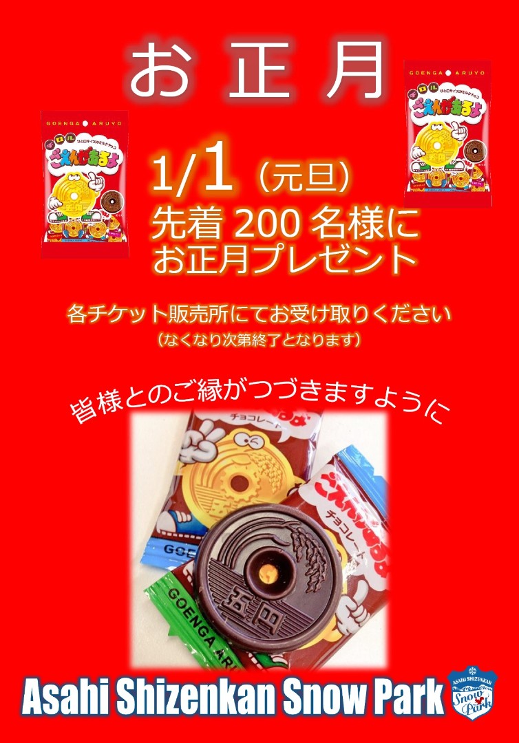 2022年1月1日元旦は、お年玉イベントとして ご来場のお客様先着200名様に「ごえんがあるよ」チョコをプレゼント! 各リフト券販売所にてお受け取りください。 ※なくなり次第終了となります