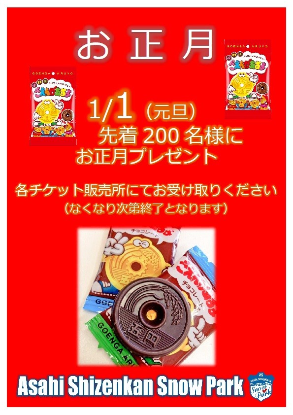 2021年1月1日(金)元日はスノーパークお年玉イベントを開催します 先着200名様に200名様に「ごえんがあるよ」チョコをプレゼント 各リフト券売り場でお受け取下さい (なくなり次第終了となります)