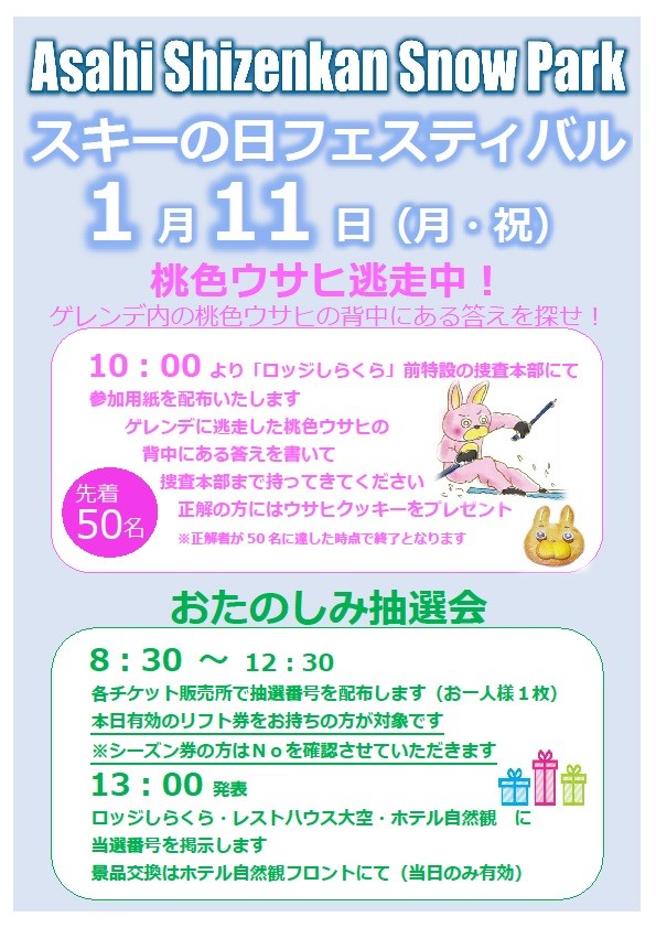 2021年1月11日(月・祝)は「スキーの日フェスティバル」を開催いたします。 小さなお子様からご家族皆さんで楽しめるイベント内容となっていますので、ぜひお越しください。 10:00~【桃色ウサヒ逃走中】 「ロッジしらくら」前特設捜査本部にて参加用紙を配布します。 ゲレンデに逃走した桃色ウサヒの背中のキーワードを書いて捜査本部に持って来てください。 8:30~12:30【おたのしみ抽選会】 当日有効のリフト券をお持ちの方に 各チケット販売所で抽選番号を配布します。(お1人様1枚) 13:00【抽選番号発表】 ロッジしらくら・レストハウス大空・ホテル自然観に当選番号を掲示。 景品交換はホテル自然観フロントとなります。