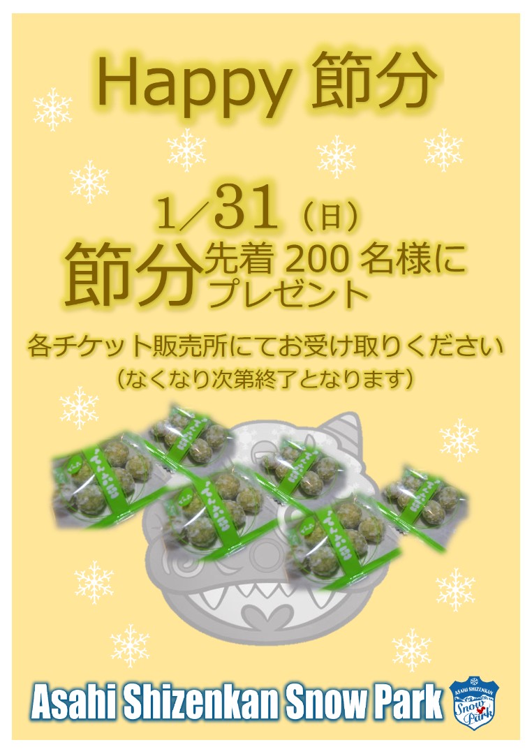 2021年1月31日(日)は節分イベントを開催いたします 先着200名様に小さなプレゼントをご準備いたします。 各リフト券販売所にてお受け取りください。 (なくなり次第終了となります)