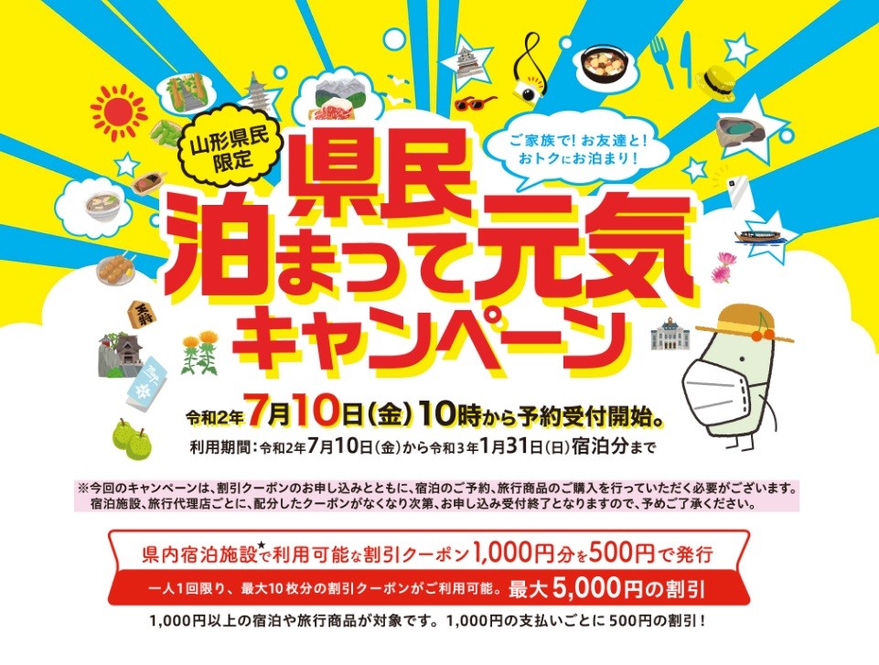【山形県民限定】 最大5,000円割引となる県民泊まって元気キャンペーンが始まりました。 Asahi自然観は「A 宿泊施設発行型」と「B 旅行代理店発行型」どちらも対象施設となっています。(ホテル、コテージともにご利用可能です) たいへんお得なキャンペーンです。クーポンは数に限りがありますので、ご予約はお早目にお願いいたします。 ※宿泊施設発行型をご利用の際は、お電話でクーポンの予約をしていただきます。ご宿泊のご予約はお電話又は公式ホームページの予約ページからのみが対象となります。(旅行予約サイトや旅行会社からのご予約は対象外となります) ※旅行代理店発行型をご利用の際は、対象の旅行代理店までご相談ください。 詳しくは下記ホームページにてご確認ください 「県民泊まって元気キャンペーン」(外部サイト) yamagata-genki.net