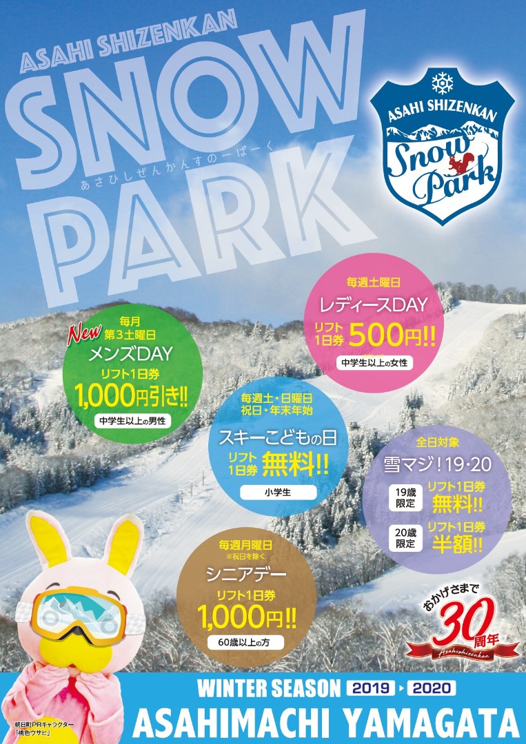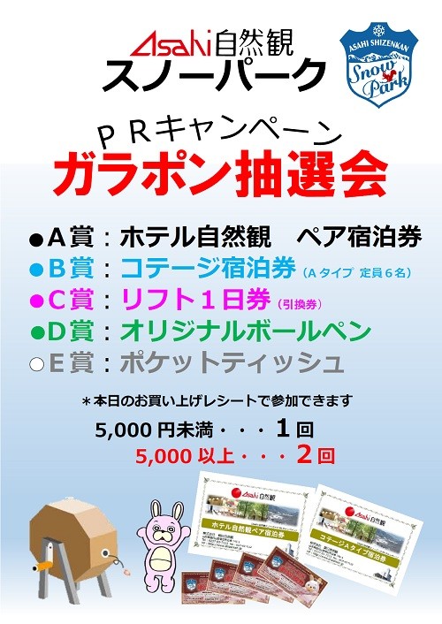 自然観スノーパークキャンペーン @道の駅 あさひまち 日時:12/7(土)・12/8(日) 10:00 - 15:30 ●道の駅 あさひまちの当日レシートでガラポンチャレンジ ●リフト一日券(引換券)を特別価格2,800円で販売 シーズン券も受付けしております スキー場オープン直前!お得なキャンペーンをお見逃しなく