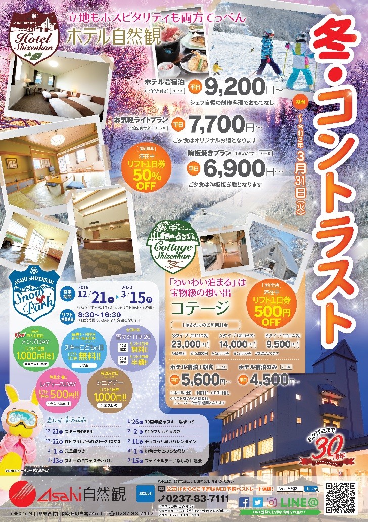 Asahi自然観 冬のプランのご案内です。 白銀の世界で過ごす休日をお楽しみください。 スキー場リフト券のご宿泊特典割引もご用意しております。 ご宿泊頂いた全てのお客様に当たる30周年特別スピードくじ企画も引き続き開催中です。 Asahi自然観 冬のリーフレット(PDF)