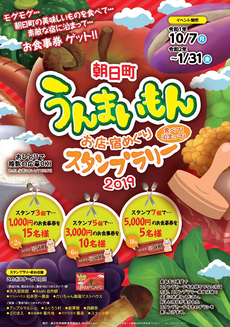 恒例となりました、朝日町の美味しいものを食べて宿に泊まってお食事券が当たる!「朝日町うんまいもん お店・宿めぐり スタンプラリー2019」が始まりました。 対象の飲食店や宿泊施設でご飲食やご宿泊によるご利用によりスタンプを集めてご応募ください。 Asahi自然観では、ご飲食とご宿泊がスタンプの対象となり、スタンプラリーの台紙はホテルフロントにありますので、ぜひチャレンジしてみてください。 朝日町うんまいもん お店・宿めぐり スタンプラリー2019