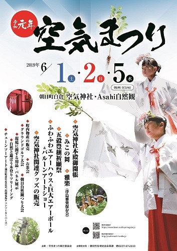 朝日町では世界環境デーに合わせ6月5日を「朝日町 空気の日」に制定し、毎年6月5日とその日に近い土日に「空気まつり」が催され本殿の一般公開や巫女の舞が披露されます。 元号が新しくなり令和元年記念の催しとして、プチプチで知られる川上産業様の協力のもと、空気神社境内の新鮮な空気をお土産としてお持ち帰り頂ける新しい企画もございます。 ◇期日 令和元年6月1日(土)・2日(日)・5日(水) ◇場所 Asahi自然観 空気神社 ◇主な内容 【6/1(土)】 空気神社本殿御開帳 10:00~15:00 巫女の舞 奉納 13:00~15:00 朝日町特産品販売 10:00~15:00 お子様無料イベント 10:00~15:00 【6/2(日)】 空気神社本殿御開帳 10:00~15:00 巫女の舞 奉納 10:30~13:00 浮島雅楽演奏 11:00~12:00 朝日町特産品販売 10:00~15:00 お子様無料イベント 10:00~15:00 Asahi自然観釣り大会 9:30~11:30 【6/5(水)】 空気神社本殿御開帳 10:00~15:00 ◇土曜、日曜は他にもイベント多数開催します。ぜひご来場ください。 詳細は下記「空気まつり【PDF】」をご覧ください。 「空気まつり【PDF】」 ◇空気神社についての詳細は、こちらをご覧ください。 【空気神社】(Asahi自然観HP内)