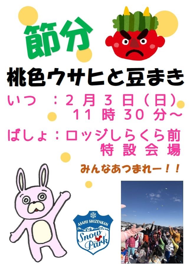日時:2月3日(日) 11時30分~ 場所:ロッジしらくら前 特設会場 ウサヒと一緒に豆をまいて今年の福を呼び込みましょう。 当日はこどもの日(小学生以下のリフト一日券無料)です。 是非お子さまとご参加下さい。