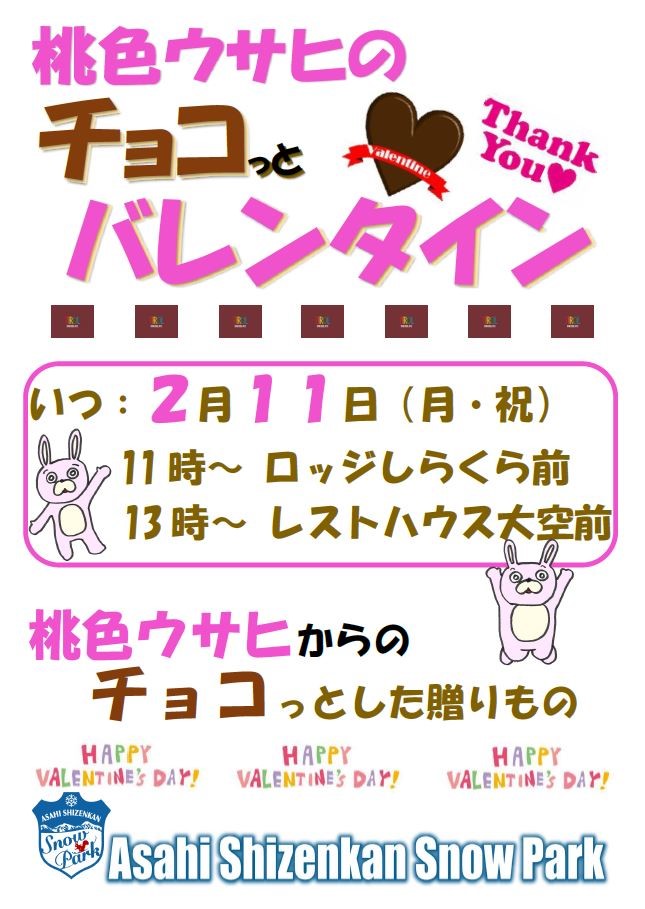 日時:2月11日(祝) 会場:11時~ ロッジしらくら前 13時~ レストハウス大空前 バレンタインDAYにはちょこっと早いのですが、桃色ウサヒが遊びにやってきて、集まってくれたお友達にチョコっとしたプレゼントを配ってくれます。 当日はスキーこどもの日(小学生リフト無料)も開催。 ご家族皆さんで遊びにいらしてください。