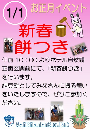 新春恒例「餅つき」を開催いたします。 日時:2019年1月1日(元旦) 場所:ホテル自然観正面玄関 時間:午前10時より ※ついたお餅は納豆餅として振る舞いをいたします。無くなり次第終了となります。